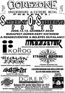 December 13-án, szombaton, ingyenes koncert lesz a Gorezone szervezésében, a budapesti Dürer Kertben. A Saturday of Sufferint Party fellépői: